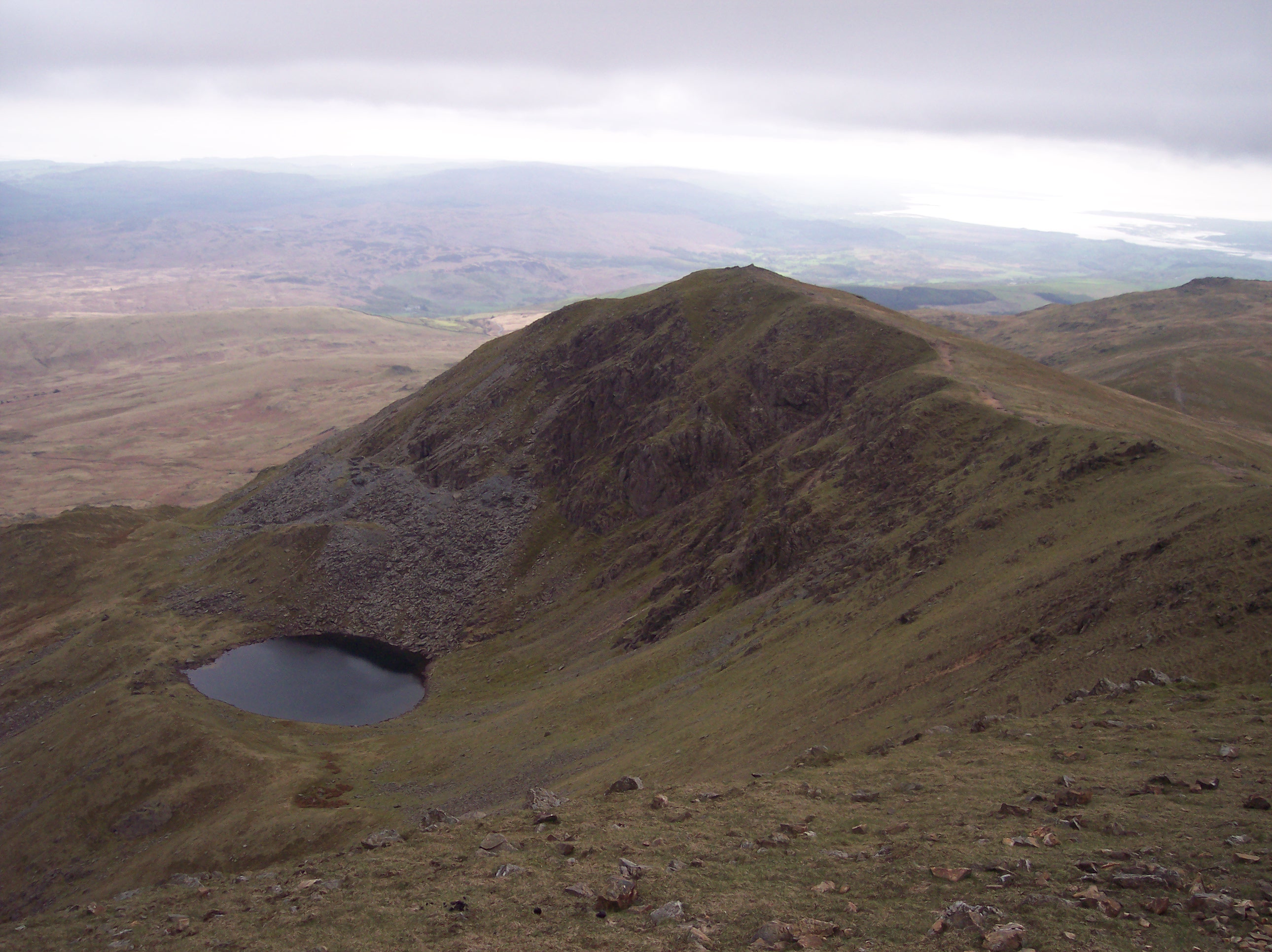 After slogging upwards for 2 hours, at 1pm I call a lunch stop at the cairn on Brown Pike. When I arrived at the Walna Scar pass I briefly detoured left to the summit of Walna Scar itself which only took 10 minutes, but my slow trudge on the rest of the ascent was practically reverse. I’m nowhere near where I need to be to get everything done today.