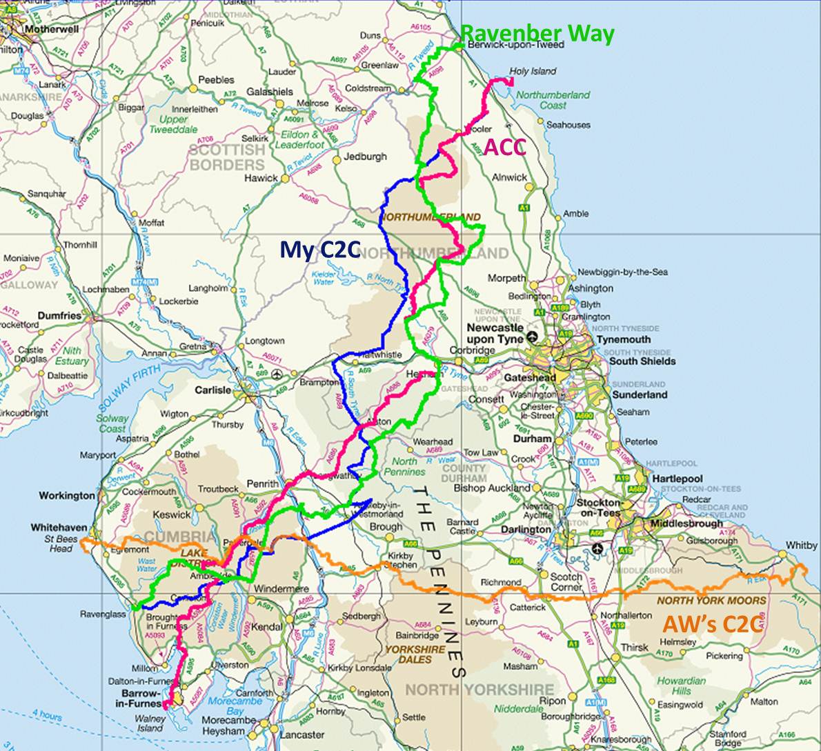 So if I didn’t fancy the standard route, or a variation on it, then why not craft my own ?  It was about this time that I found out about the Alternative Coast to Coast and the Ravenber Way.  I bought both books from Amazon, and although I’ve not actually read either of them through, I have dipped in and out for inspiration.  First the choice of end point – Holy Island – came straight from the ACC.  Indeed before the book even arrived, I’d pretty much decided on this.  But I couldn’t get excited about the start point of the ACC – Barrow-in-Furness.