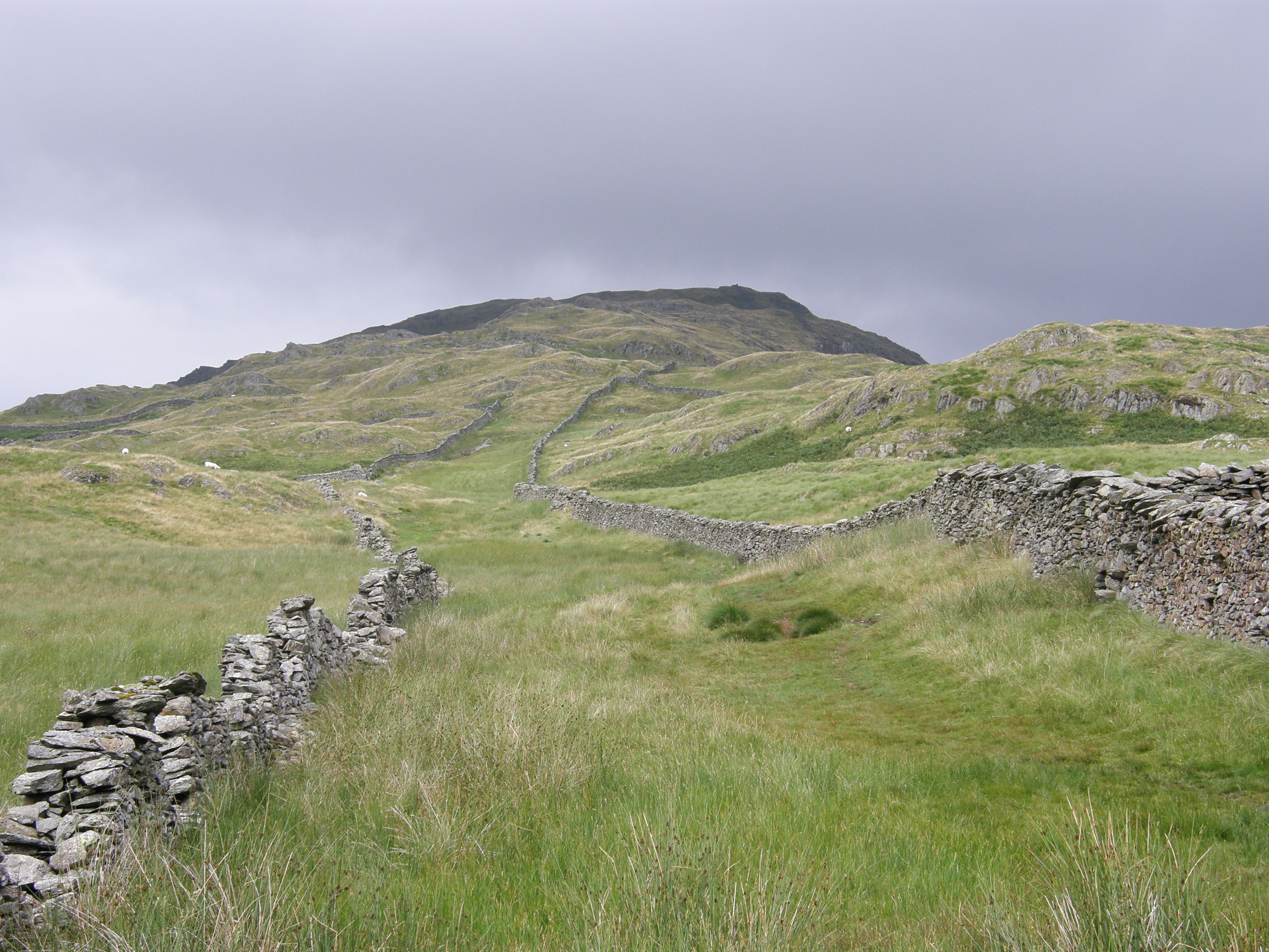 The walls run out as the path climbs over the first crags and up onto Snarker Pike. From then on a more mountain feel takes over – especially on the day I did the walk, as I climbed into the cloud base at about 550-600m.