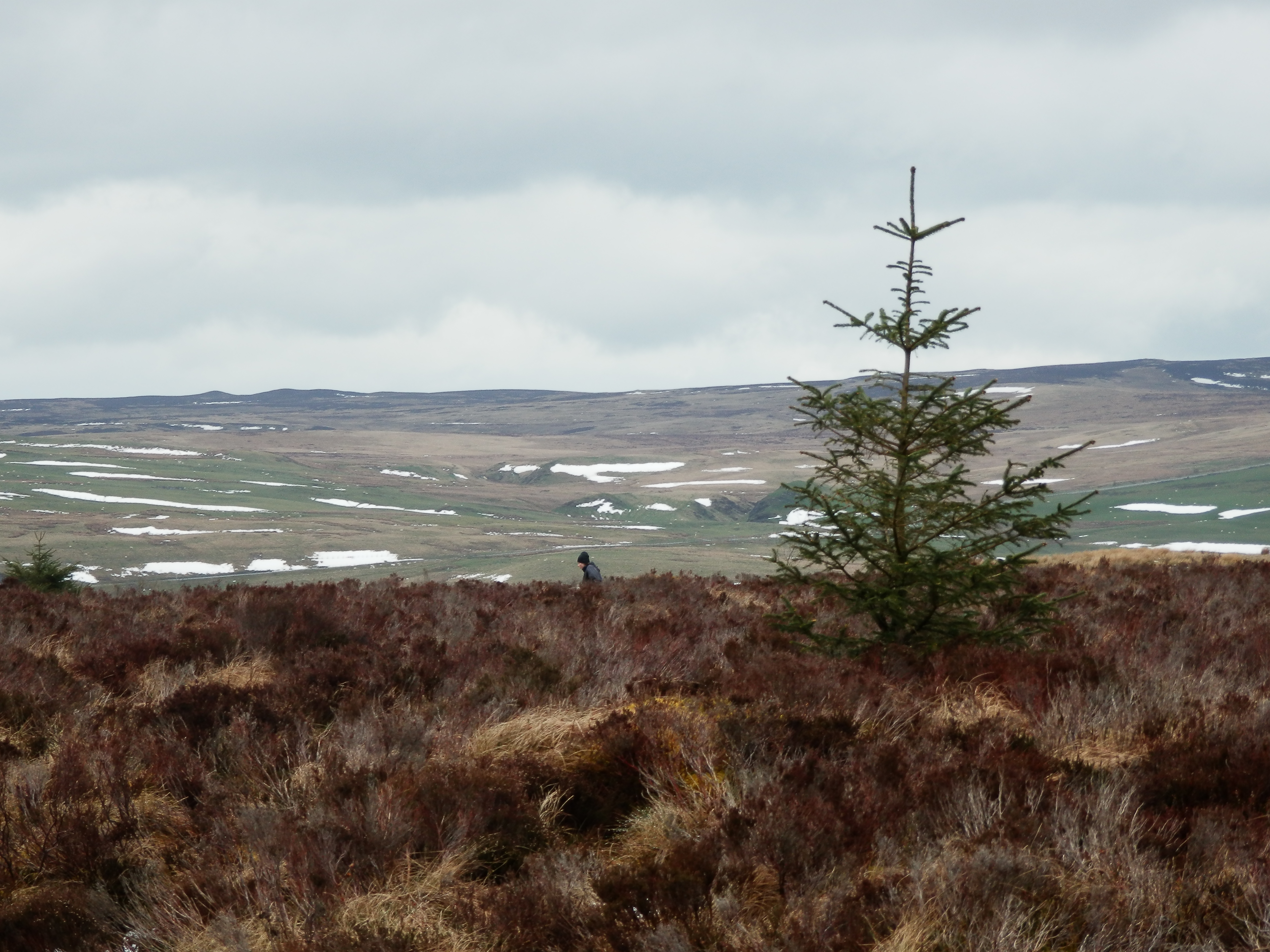The next morning, the window-pane was wet with overnight precipitation as I sat up in bed and looked out west across the moor. A sky grey with mist above the yellow and browns of the moor, and dotted with patches of white snow. We lazed around in the morning before stirring ourselves into action at lunchtime. With much of the day gone, a short walk seemed like the thing to do and by 1:15 we were setting out. And it would be a relatively short walk – at nearly 400m above sea level we had very little climbing to do to get to the top of Mwdwl-eithin at 532m, a Marilyn and the highest point of the Hiraethog.