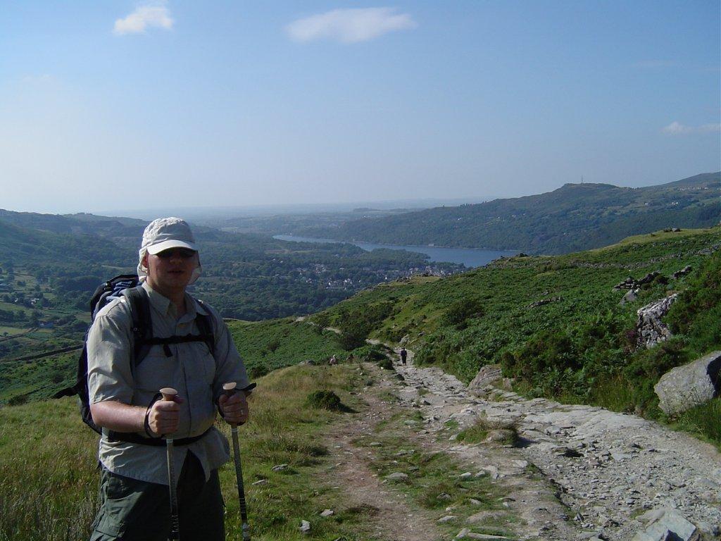 It was past midday when I drove up to Pen-y-pass and, as expected saw the car park full. I turned around and headed back down to Pen-y-Gwryd to park on the roadside. Halfway down I met Andy (yes, he had changed his over-ventilated trousers since Tuesday!) slogging his way up having just done the same, and so I dumped the children on him and carried on to the bottom. A twenty minute slog back up the road to Pen-y-pass warmed the legs up nicely, but I was slightly miffed to see the others already setting off on the Miners Track. I took my time, used the facilities, and then set off in pursuit, catching them easily as I didn’t have a five year old to slow me down, but did have the advantage of Pacerpoles. We climbed gently up with frequent pauses for Ben’s much shorter legs and it took nearly 50 minutes to reach Llyn Llydaw, where we had a short rest and took in the view of the summit ahead, Crib Goch on the right, Y Lliwedd on the left and Moel Siabod behind.