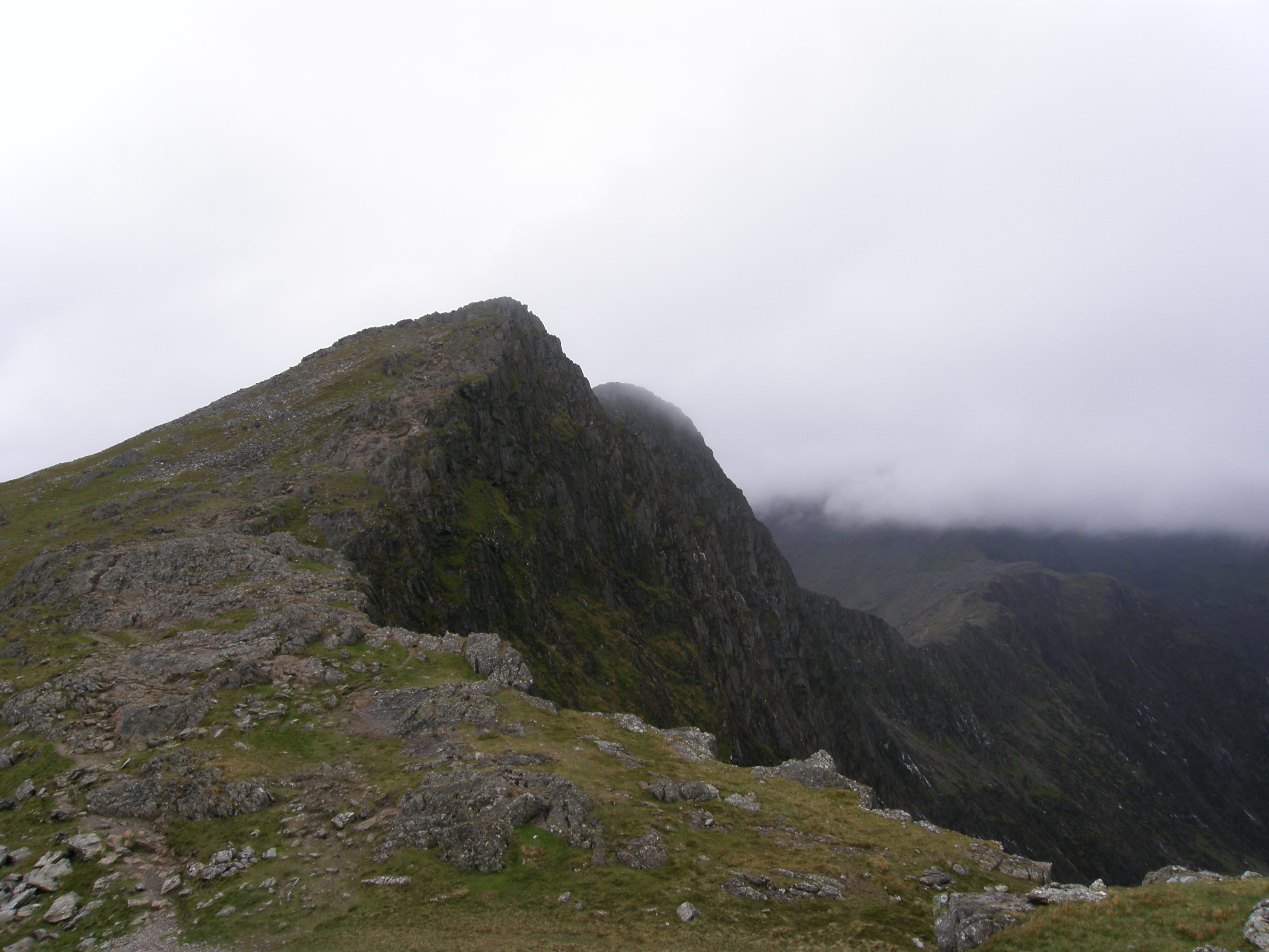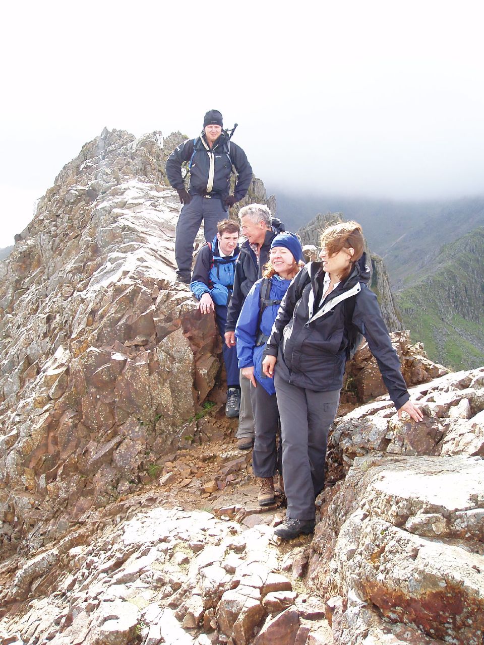 It wasn’t until my third visit that I could actually claim to have summitted the mountain that so many non-hillwalkers have. In September 2007, with my (outdoor) life-changing sabbatical behind me, I took a long weekend to do the Welsh 3000ers as part of a small group of 5, organised by an outfit called High Trek Snowdonia. Having knocked off the Carneddau and Glyders, on the third day we turned to Snowdon and the 3 tops that completed the set. Because of high winds, we didn’t climb up via Crib Goch, instead leaving that to later in the day when the winds had died down. So we slogged up the Pyg Track to the summit, and at last I could tick Snowdon off. We then descended via Crib y Ddysgl and Crib Goch. Apart from finally conquering the mountain, that day was also notable for the sight of a guy walking his tiny dog (some sort of small terrier) along the crest of Crib Goch on a lead. Having just come off the hairiest bit, we advised him accordingly and he promptly picked the dog up and walked along the crest of the ridge with it under his arm until he disappeared from sight (horizontally that is, not 1000ft downwards!).