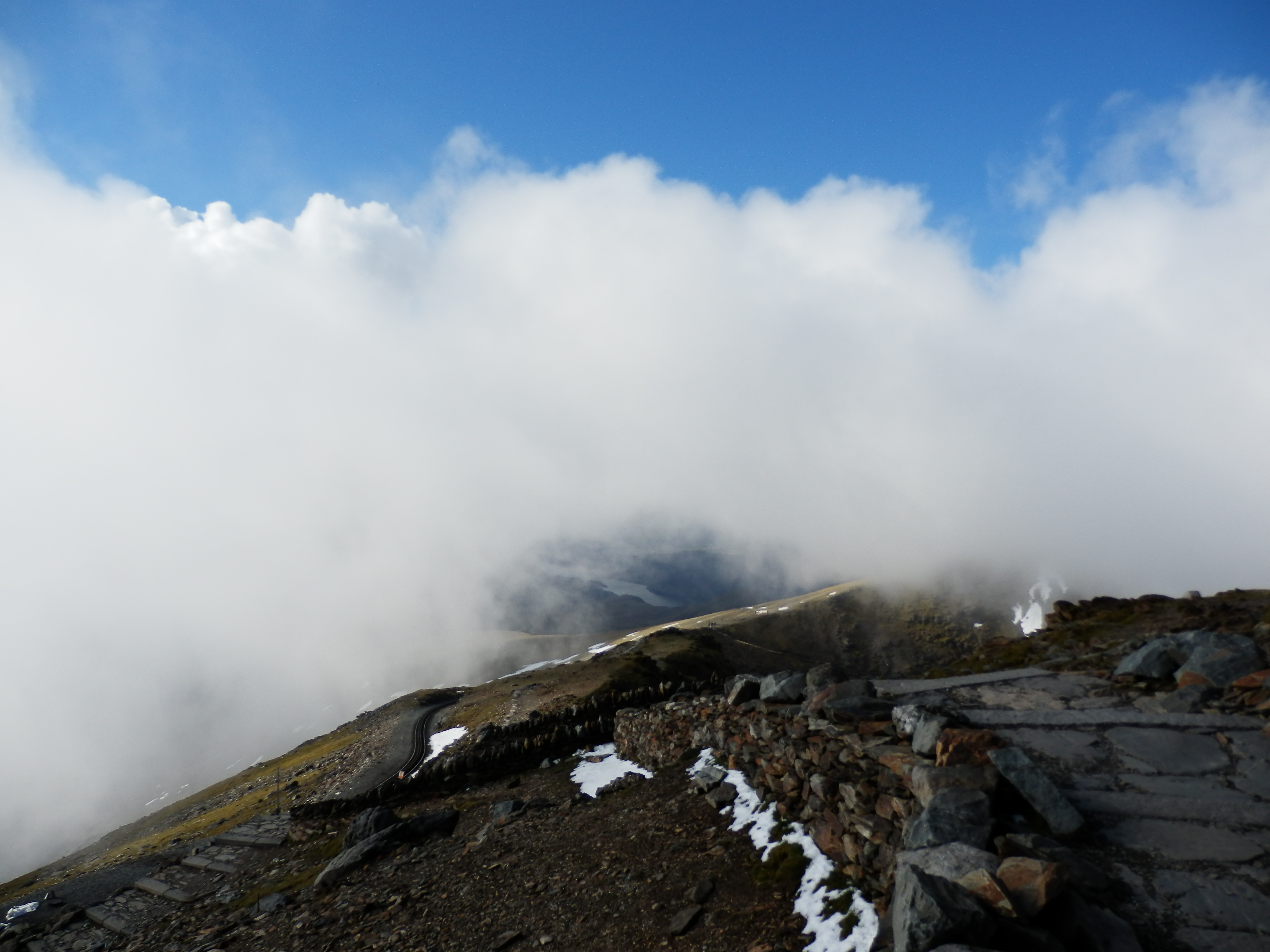 The cloud swirled around us as we climbed the last 300 ft to the top, the wind growing with every step. Up to the summit we went, posed for pictures, and headed straight down for the cafe and hot chocolate.