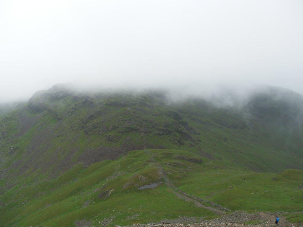 I packed up and headed uphill onto Yoke, following the path by the wall in these misty conditions. Boggy patch after boggy patch was negotiated before the main path was joined and the relative security of stones underfoot. The wind rose as I rose and rain was thrown at me in waves. After staring down the weather yesterday, today it was up for the rematch. And won convincingly.