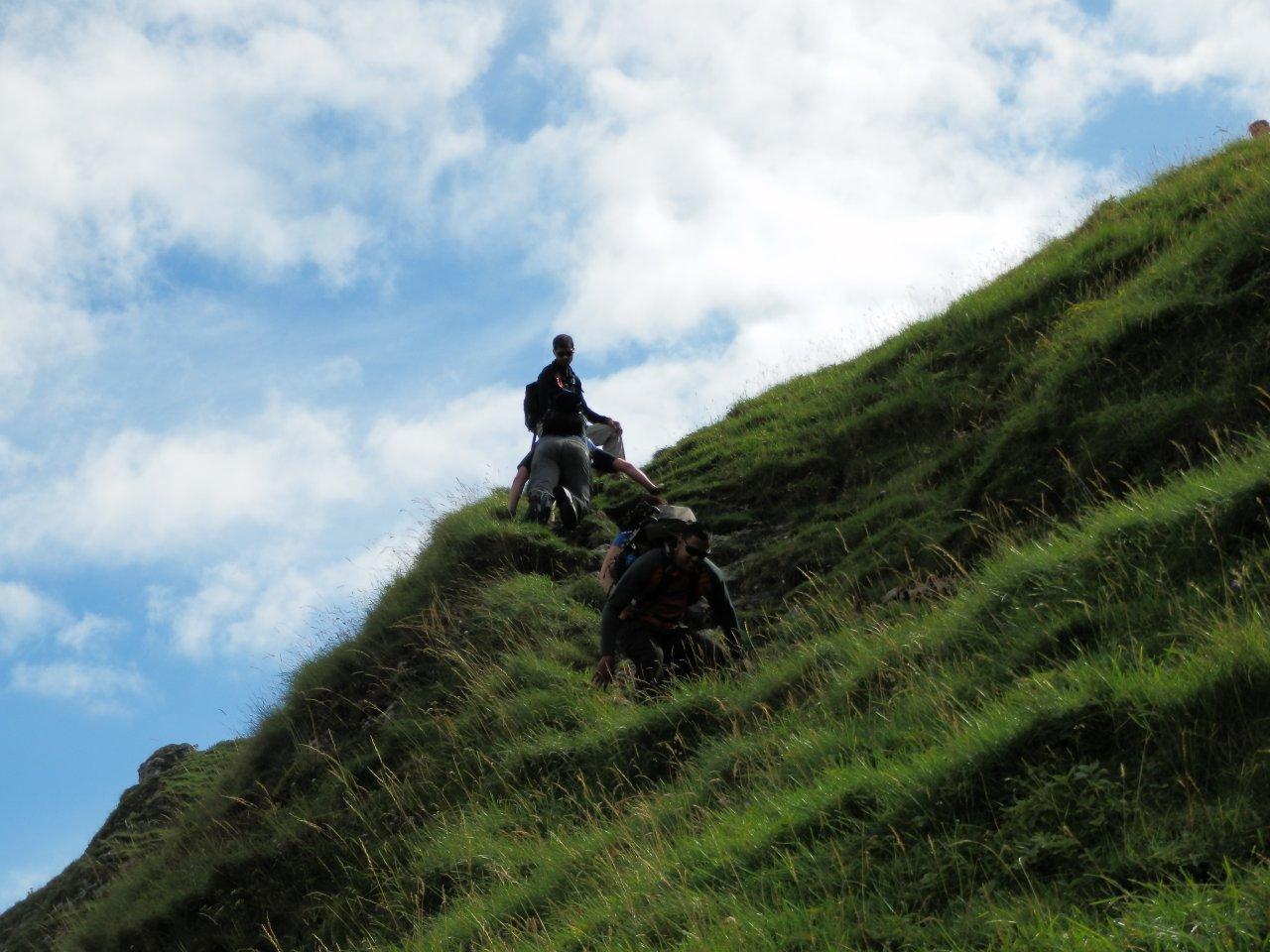 The descent began and with the rain that we’d had the path consisted principally of wet rocks and mud.  People who were clearly locals out walking their dogs raced past us over precarious routes while we bum-slid and lurched from slip hazard to slip hazard. The final sting in the tail came as we turned left to descend just to the side of the hill’s nose. A badly eroded path which was little more than a twisting mud slide saw the party string out as the more intrepid picked their way carefully down and the rearguard shat themselves.