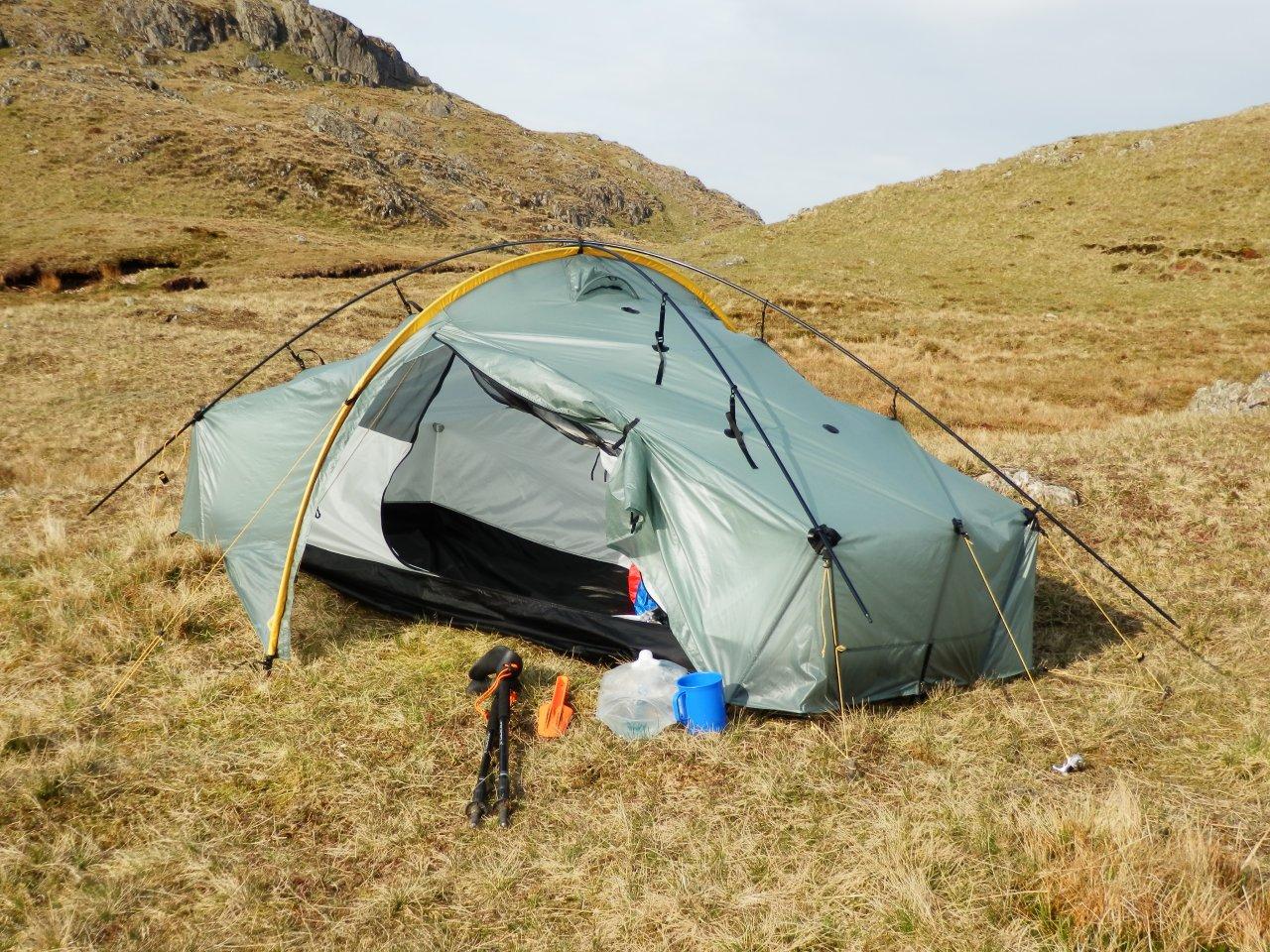 I don’t always use the crossing poles because they are a bit of a pain to put on. On my first wild camps in the Scarp, I did put them on, largely adopting a belt and braces approach. I’ve never found it windy enough to absolutely need them, but where I do find them useful is in substantial rain – they just help hold the flysheet that little bit further away from the inner, which is useful when you’re a clumsy oaf like me. The 340g is the price of confidence that I can handle whatever conditions I encounter, I guess.