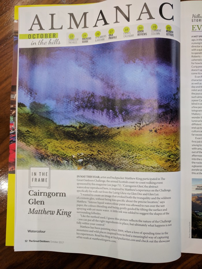 If you liked my watercolour that featured in the “In the Frame” feature in the October issue of TGO Magazine, and have been burning up with curiosity as to how you could get hold of it, then I’m delighted to tell you that I have a limited run of prints of “Cairngorm Glen”. These come in a 16″ x 12″ mount, which is a common frame size, so you should be able to choose your own frame to suit quite easily. The picture itself is approximately A4 size. The print comes sealed in a protective cellophane wrapping and with a certificate of authenticity for its archival quality (ie it will last a long time!)