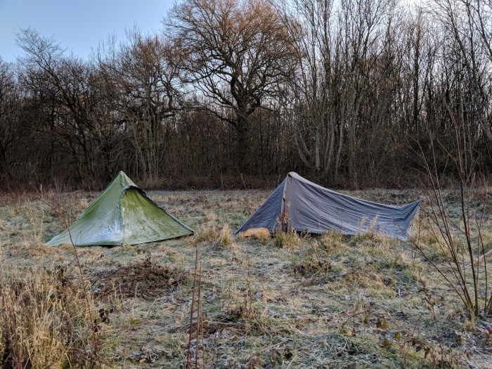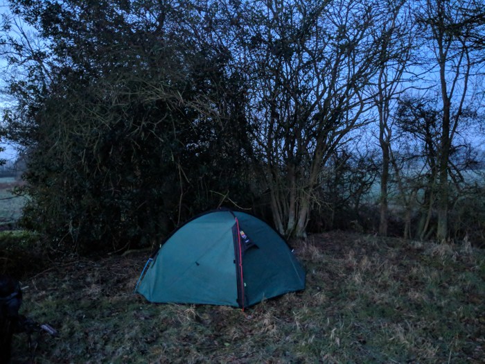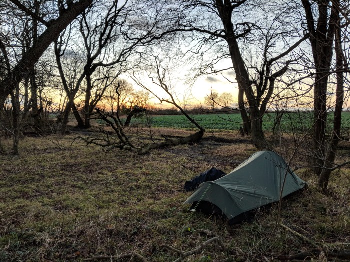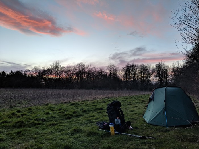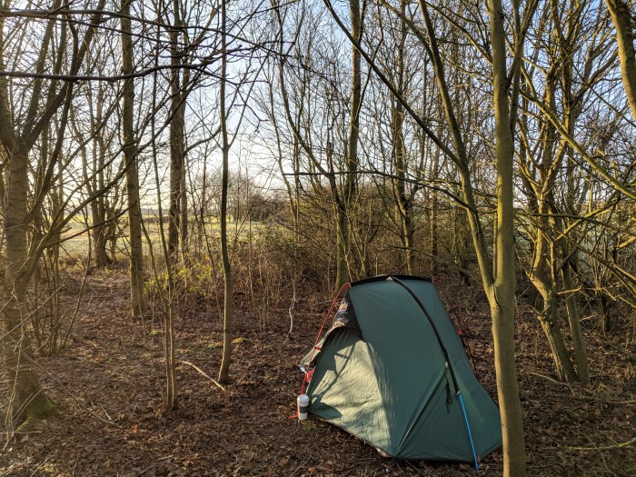 This camp reminded me of one thing – much as I loved my Snugpak Ionosphere, which is a great tent for stealth camping in the lowlands, it’s a terrible choice for winter camping. You can’t sit up in it on a long winter’s night, so you either freeze sitting outside or spend 16 hours horizontal. This camp proved to be the last outing for this shelter and I moved it on shortly afterwards. 2018 has seen me embrace camping comfort whole-heartedly. To that end, I replaced the Ionosphere with a Wild Country Helm 1, which I picked up from the seconds bin direct from Wild Country at a good price. Camp number 2 of 2018 and the second section of Essex Way was its first outing.