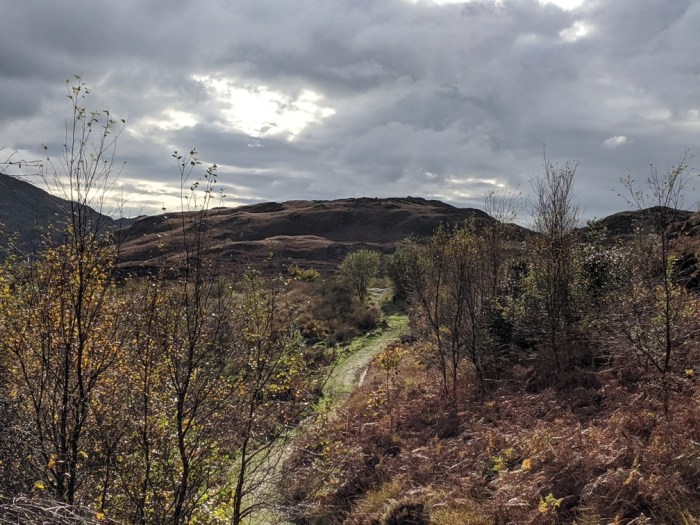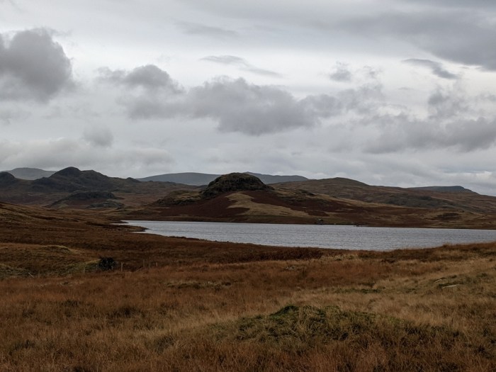 Down again I dropped down to the river, where a closed bridge had me retrace my steps, annoyingly. A short stretch along the road brought me to the bottom of the Walna Scar Road and the cheat I’d spotted on the map. Here where the Walna Scar Road emerges onto open fell is a lovely even(ish) gradual track that leads straight to Seathwaite Tarn – much easier on tired legs than the grassy footpath further up the valley. As I passed a couple of vans, a group of what looked like DofE bods were hefting packs and their most likely destination was the same as mine.
