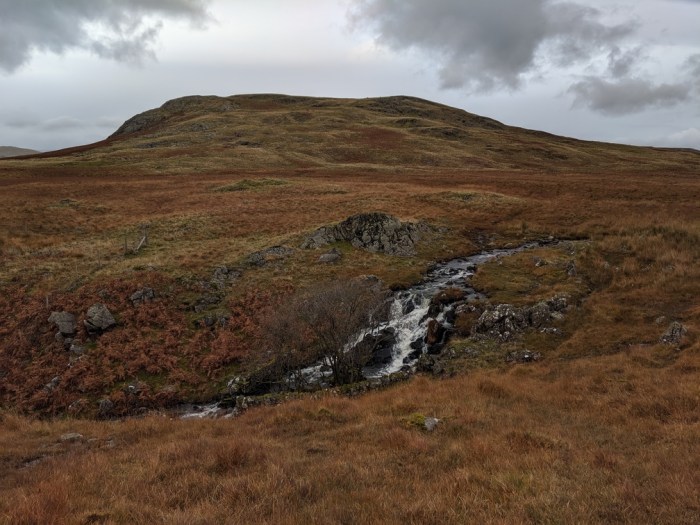 Birkby Fell and its Outlying Fells of White Pike and Woodend Height loomed above me to the right as I crested a slight rise and got my first glimpse of Devoke Water. I’d briefly been on this side of the Lake District’s largest tarn once before – 9 years ago after a fraught scramble off White Pike through the densest bracken I’d ever seen. Today was quite different. To my left a roaring proclaimed a waterfall that was Linbeck Gill accelerating away from the tarn. Just above the waterfall yielded not only a place to cross but also further liquid supplies for camp.