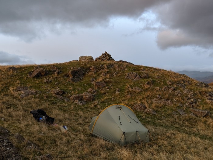 I climbed up to the top of Water Crag and looked for that elusive combination of a high, sheltered, flat spot with a great view. And you know what ? I found one. The tent was up soon before sunset, which I watched as dinner cooked.