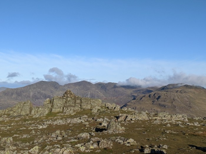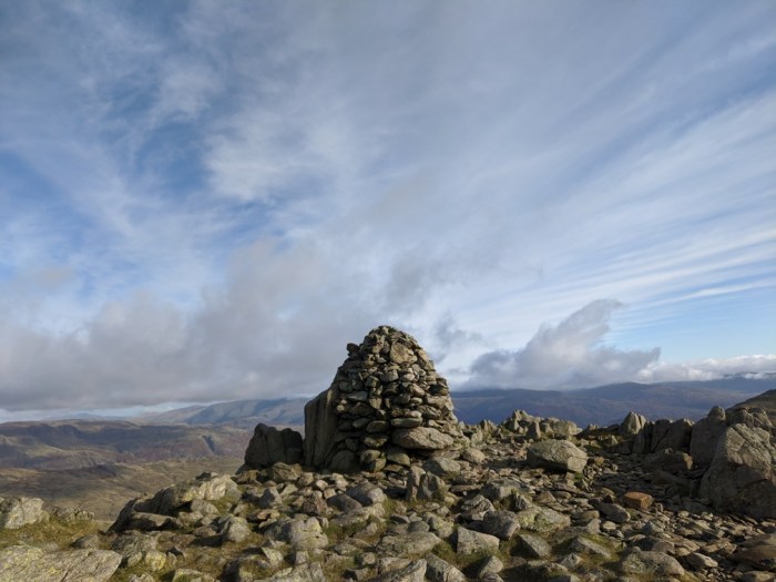 I stood on the summit and took in the view. To the north the Scafells and all of upper Eskdale looked majestic in the sunlight and the autumn colours. The summits of Great Carrs and Swirl How added Helvellyn to the mix. Best of all there was no one else around – I had the fells to myself.