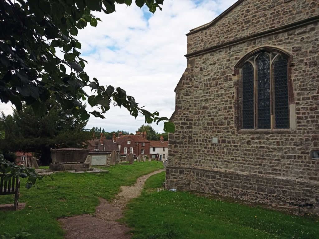 I emerge at the village war memorial. Last time I was here, it was bustling with Sunday morning cyclists and a noisy clamour for parking spaces. None of that today – the place seems deserted. I walk along the empty main street and into the churchyard.