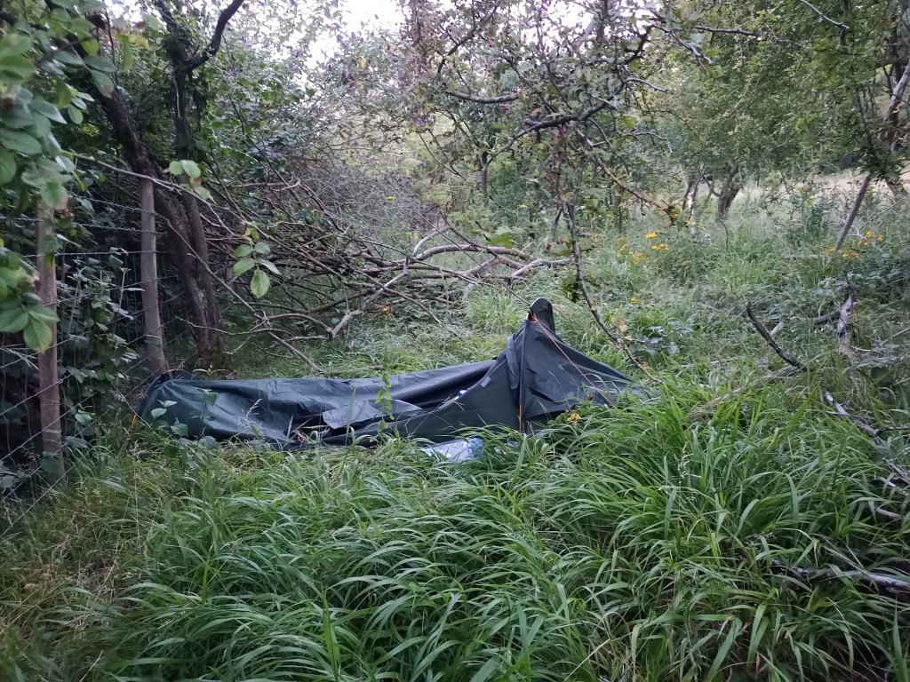 The next field is a pretty scraggy affair and clearly isn’t frequented much. It will do. But it’s a bit slopy, and a few spots are passed up. Finally I find somewhere that will do (just) at the bottom of the field right by a hedge. A few sticks need to be moved, and the orientation of the bivvy is pretty much determined by the slope.