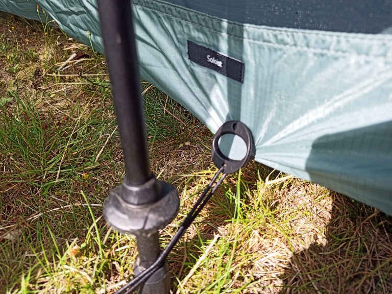 The biggest issue was the rear corner vertical seams which fell close to the fly. Luckily these have mitten hooks half way up for attaching to the MLD fly, so i tied a length of shockcord to these and pulled forward to the point where the soloist inner would attach at the front. This flattened the corner and side a little, but not in any way that would be an inconvenience.