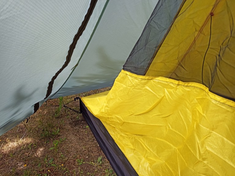 The fly is constructed of 30D silnylon, treated on both sides. The inner is mesh with a 30D silnylon floor. The sides of the inner slope straight down to the corners – there’s no vertical bathtub bit at the bottom.