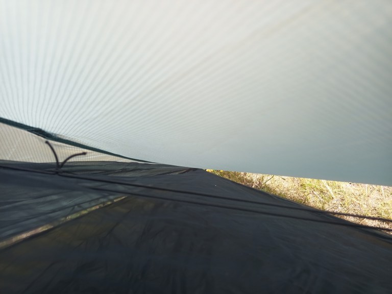 I woke up after my first night in the tent and found my feet and quilt touching the mesh. With a Thermarest Xtherm mat under me, either my head or my feet touches the mesh, which is not what I’d choose. Luckily the separation between inner and fly is good, so even touching the mesh doesn’t get anything wet anyway.