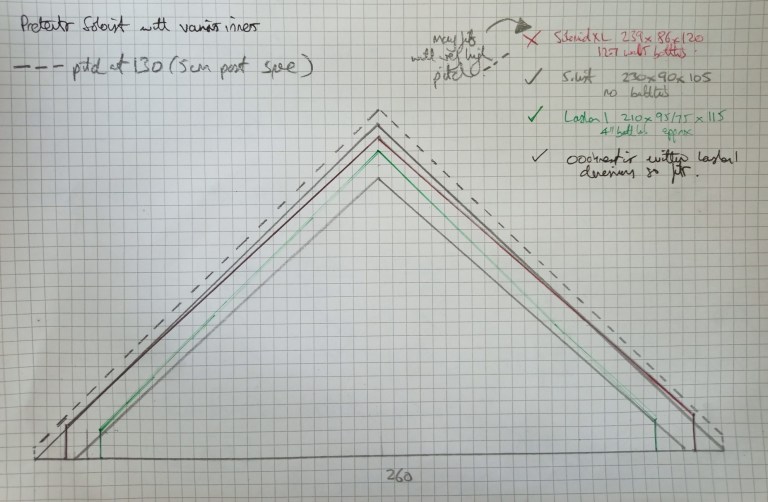 So, I put pencil to paper and sketched out the fly, marking the fit of various others inners – an old oooknest, a Lanshan 1 inner and my MLD Solomid XL inner, along with the tent’s own dedicated inner of course.