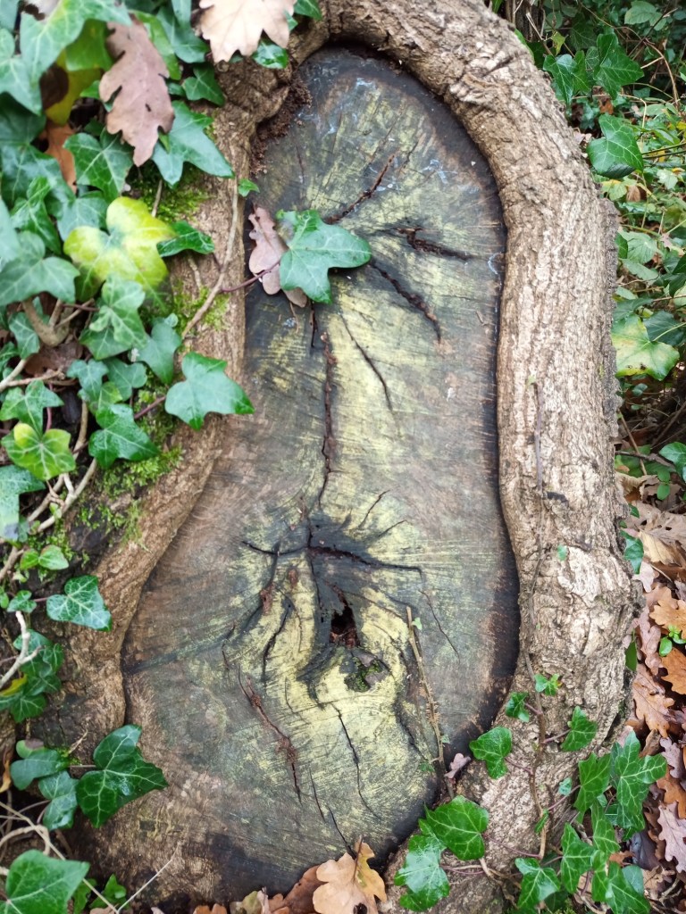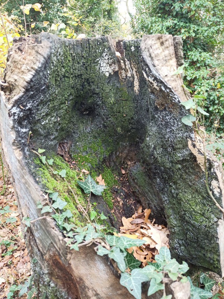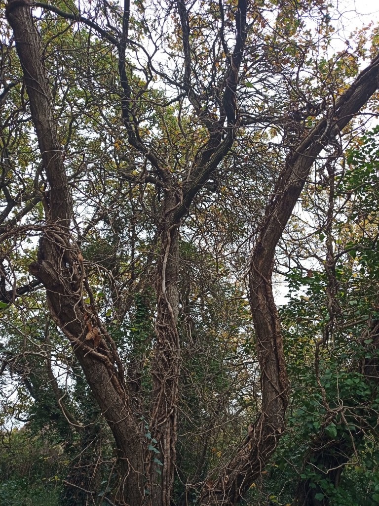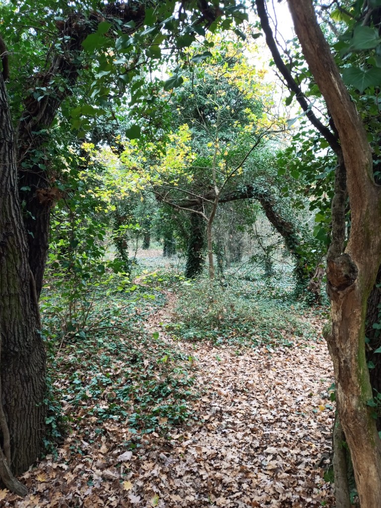The thinning opens up new routes through the middle of The Wood, narrow channels of leaves threading their way through a blanket of ivy. A blanket that twists its way up the trunks of the tree too.
