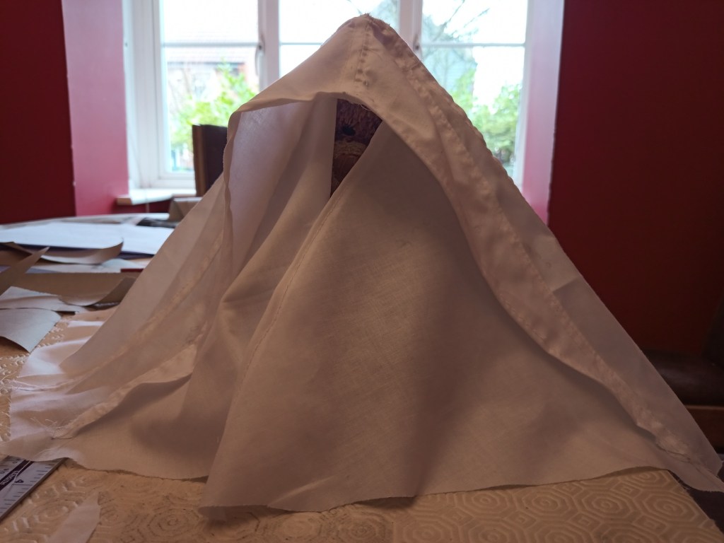 Previously, fearful about the problem of joining together 8 pieces of fabric (or maybe 6 if I leave two of the smaller panels joined on each side) at a point at the top, I’d looked to try to avoid this and “simply” have a single piece of fabric for the top, that then joins with the lower panels a little way further down. In theory, and from a novice sewers perspective, this made some sense. But all it does really is move the problem elsewhere.