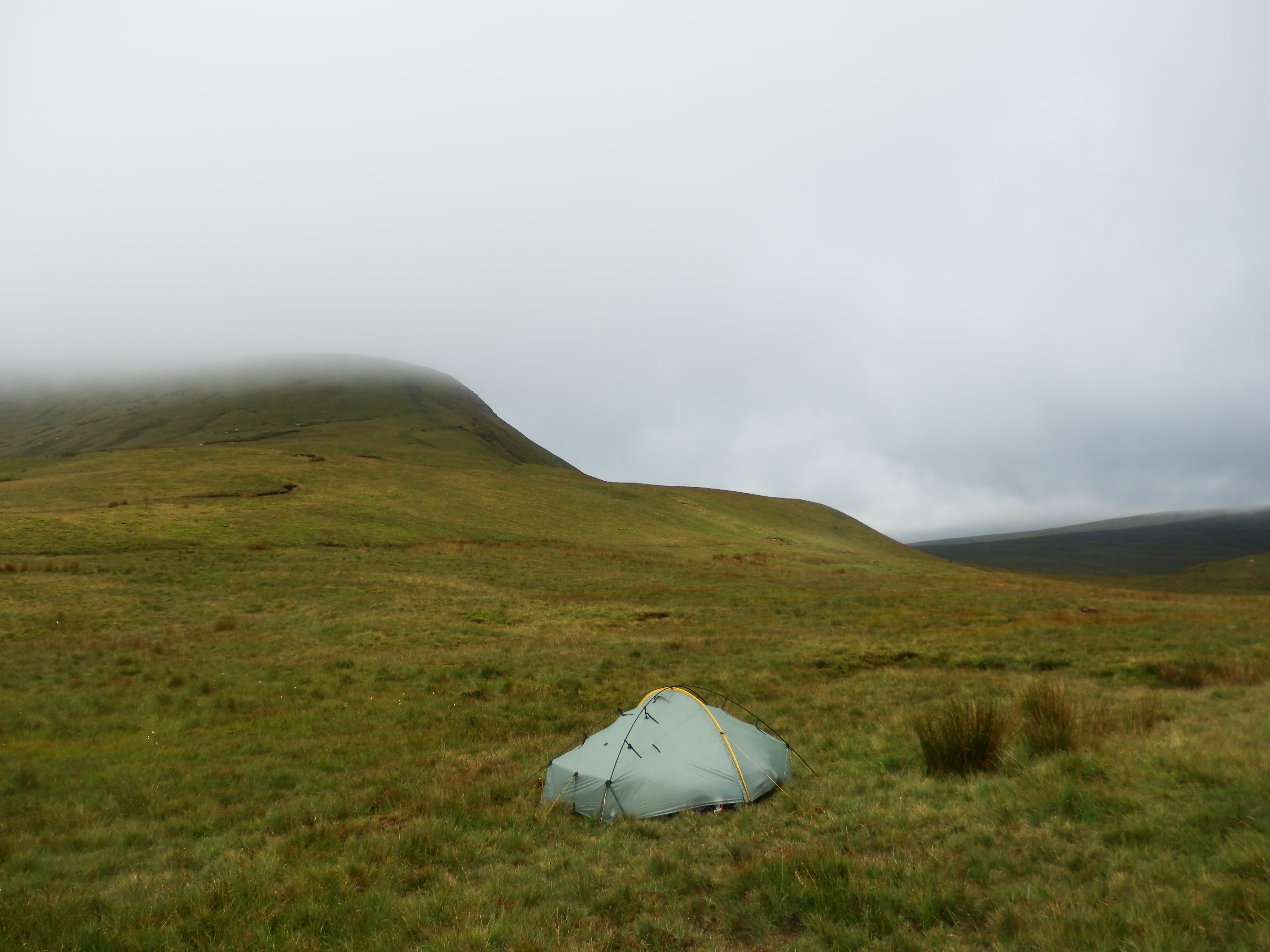 It was pretty windy, but I was reasonably sheltered in a bit of a dip, so wasn’t too bad. The rain, when it came though, really lashed down on the tent, and the next morning I sat there mostly packed waiting for it to ease off (it hadn’t been forecast to start raining until much later). And waited. And waited. It got to late morning and the idea set in of simply staying there for the day. There was unlikely to be much in the way of people out in such conditions, and I was off the path in any case. Indeed, the mist hid me well.
