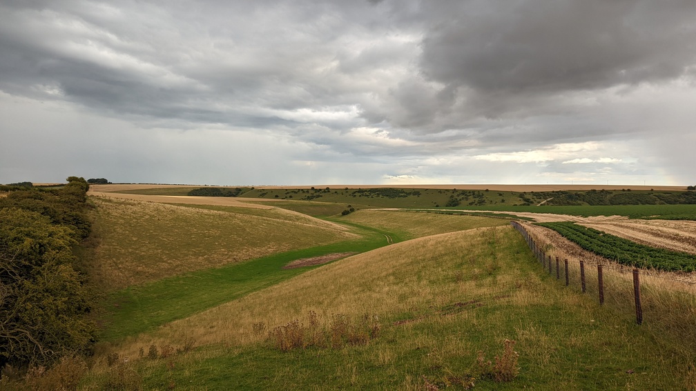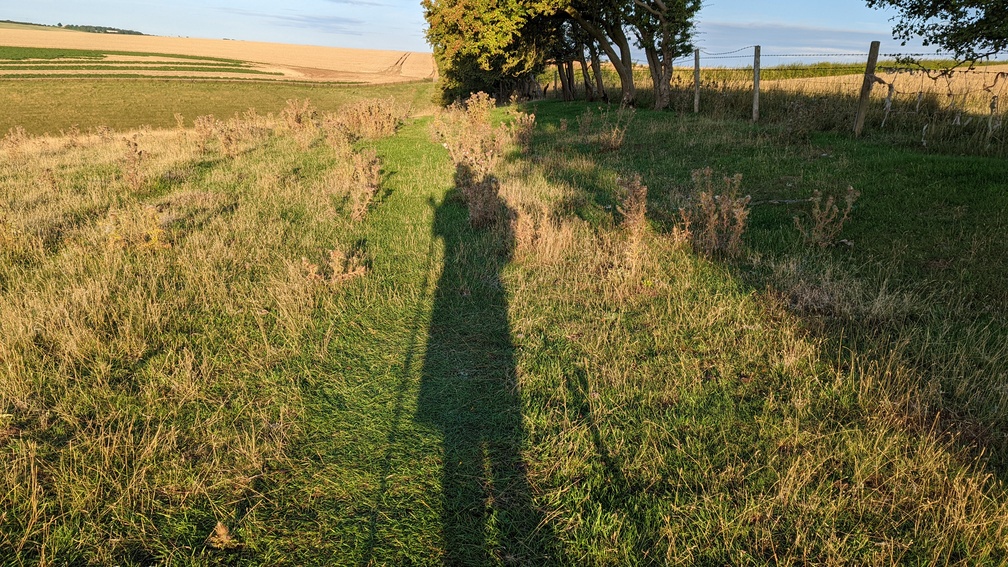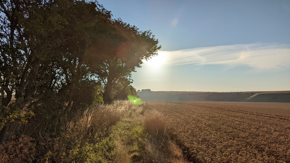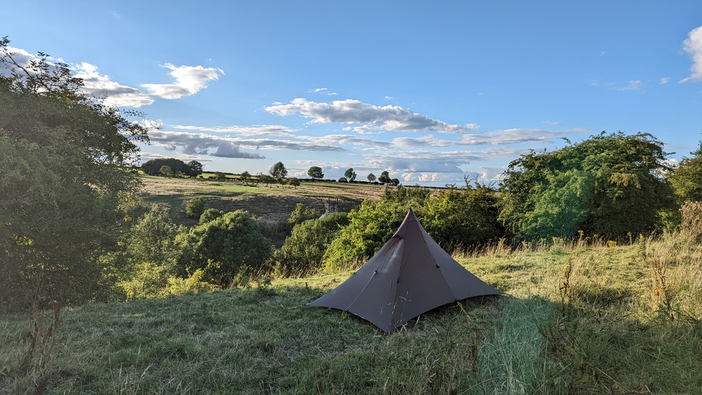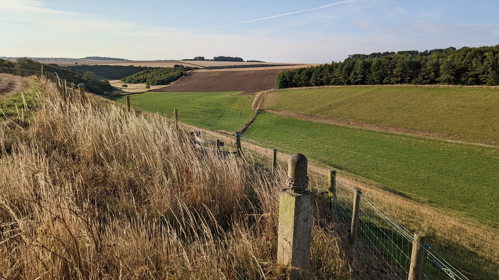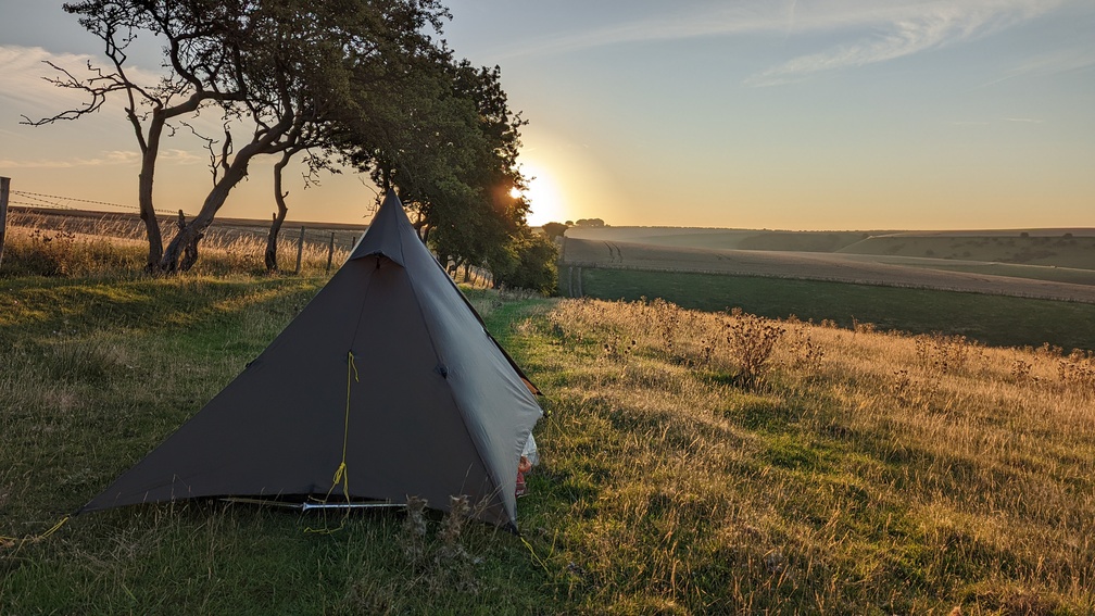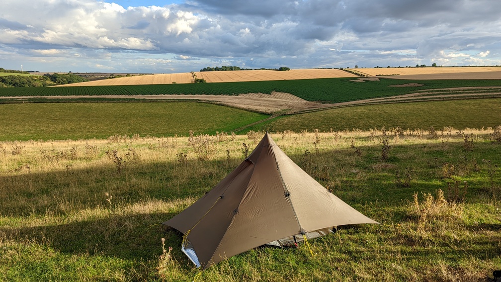 Now camping radar switched on, I descended into Cotton Dale through loads of wet brambly grass before a steep climb back out of the dale. Over a very long series of wheat fields, I found a deserted dry valley not overlooked by anything and after investigating it opted for a spot overlooking it instead. This turned out to be the furthest I’d ever walked in a day at 38.07km, with a fair bit of up and down too.