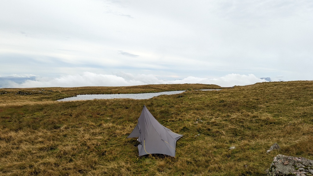 It was now time to stop for the day, and I spent over half an hour scouting around for a good spot, rejecting several due to lack of shelter, lack of flatness or lack of views. Here I made the mistake of looking for shelter from the northwesterly wind, despite knowing it was due to drop away to practically nothing. Because of this I found myself shelter in the lee of the summit outcrop with a not very satisfactory view over Llyn y Fign. If only I’d been braver and pitched right at the summit, but end of the day fatigue clouded the decision-making. I’ve been walking on the flat for too long recently.