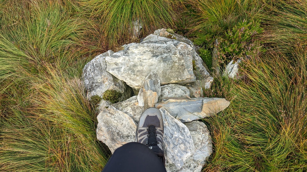 A bit more trudging later, and I was at the fence over what was previously thought to be the summit of Maesglase. It wasn’t a great camp spot, being covered in low vegetation, so I decided to push on for the real/new summit. This involved following the fence and a hop across it to the small summit cairn a little way on.