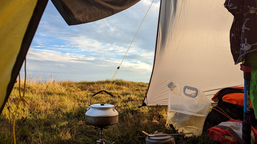 I also woke to a wet tent. Massive amounts of dew on the outside, massive amounts of condensation on the inside. There’d been almost no wind overnight. I was alerted to the problem by a drip on my neck in the early hours. Great.