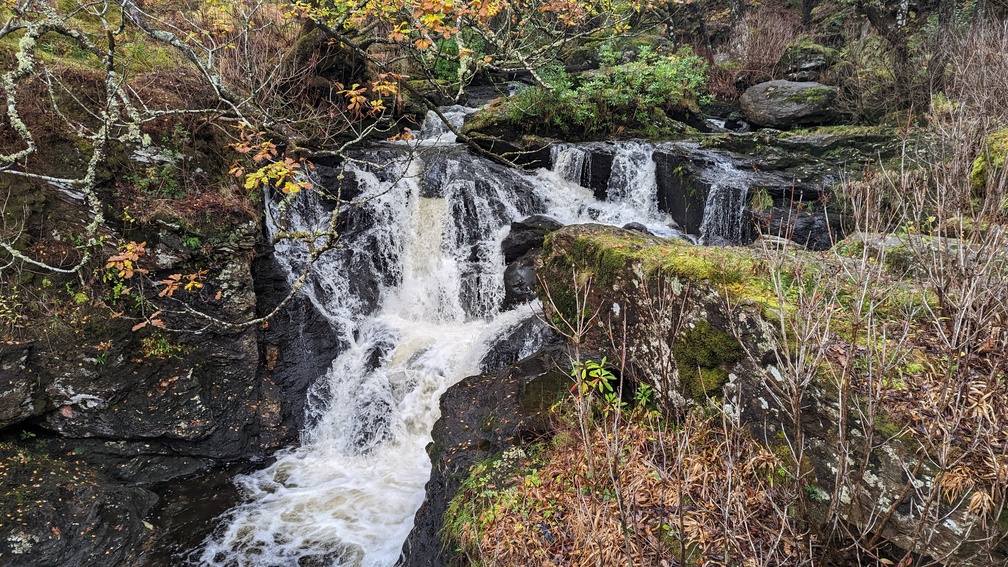 It didn’t take long to get to Inversnaid, where I found a coach party enjoying the waterfalls. Exiting the car park, I was confronted with a diversion sign for a broken bridge, but ignored it and found it easy to hop across the burn instead.