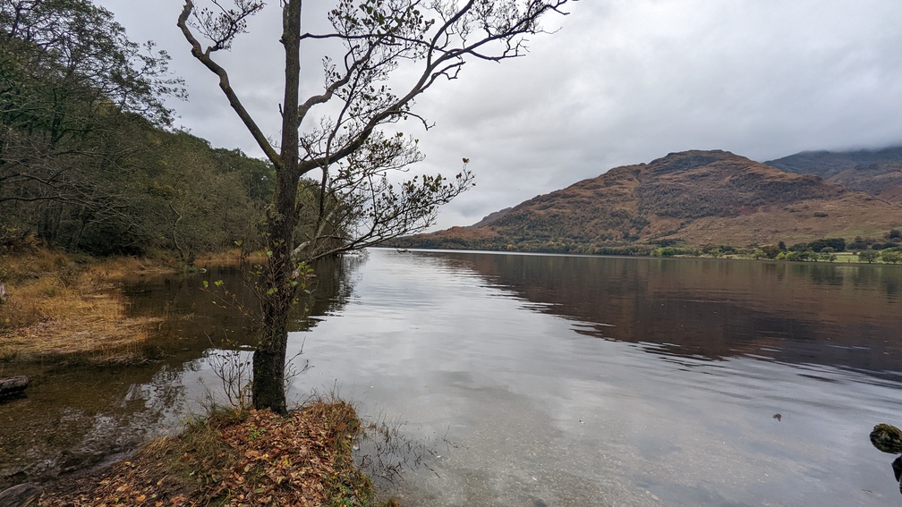 Gradually, the obstacles lessened, but not before a narrow squeeze between a tree and a massive rock. Soon I could see the end of the loch.