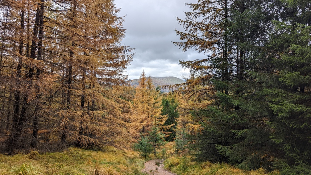 Across the A82 and railway (that darned sheep creep), I could see the forest above Crianlarich getting ever nearer. I climbed up to the halfway point on the trail, and was glad that my timings meant there was no need for a detour into Crianlarich itself – it looked a fair bit of descent and reascent.