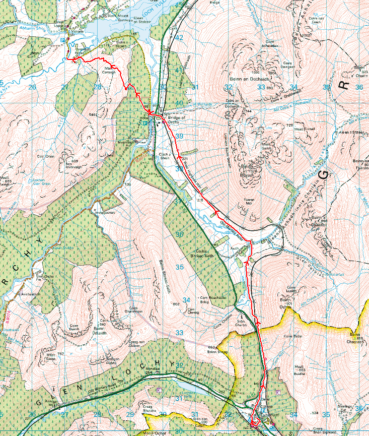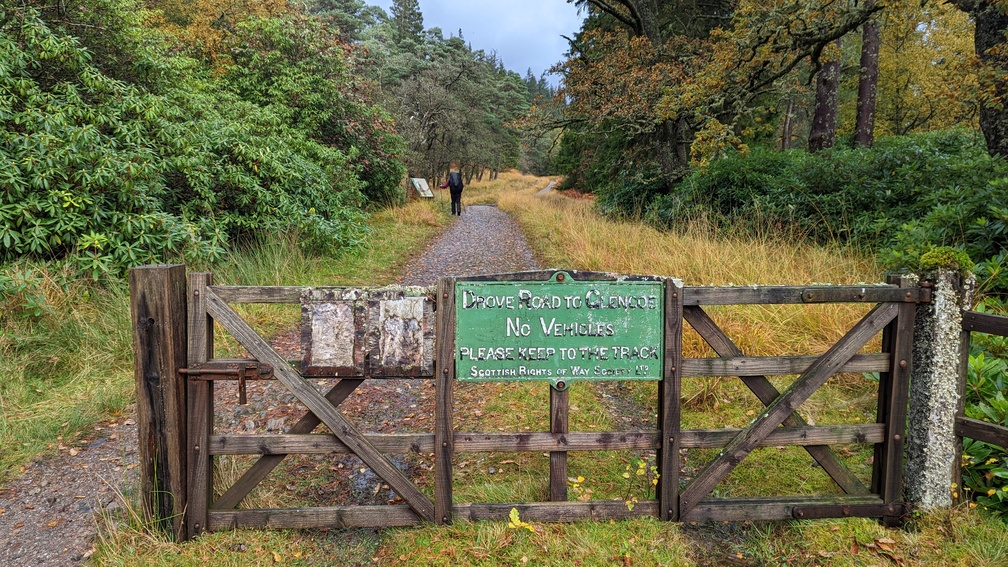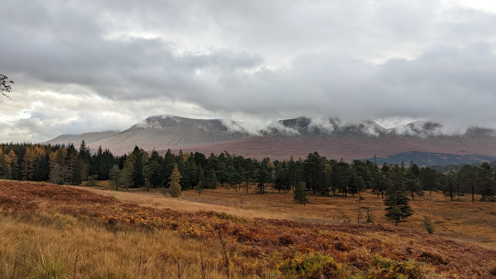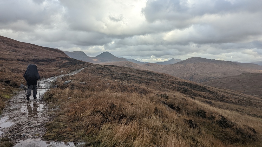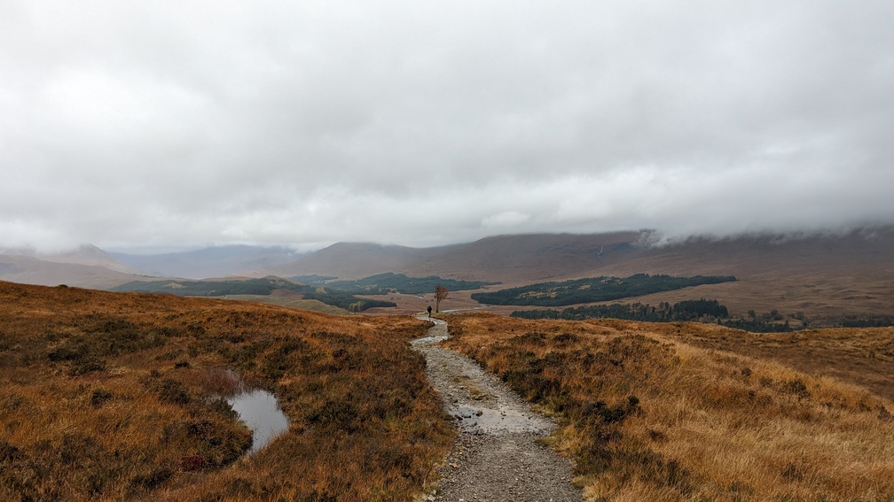 Not in any hurry now as we’d done most of what we planned to do today, we set off unhurriedly for the climb through the forest and over Mam Carraigh. At the top a cairn and then down to a lone tree where the Inveroran Hotel came into sight.