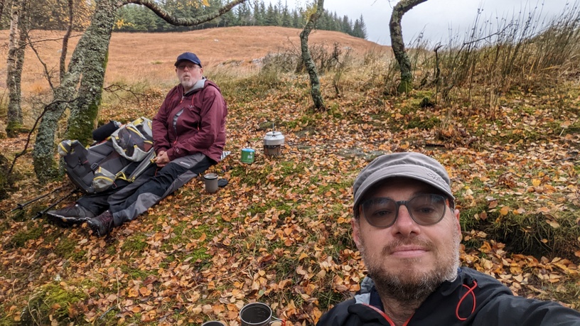 We called a rest at Ba Bridge, and got ourselves down on the slope below the path to get a bit of respite from a cool wind. Brew time. The 4 guys got a bit of a surprise arriving at the bridge and looking down over it, and then later realising we were there.