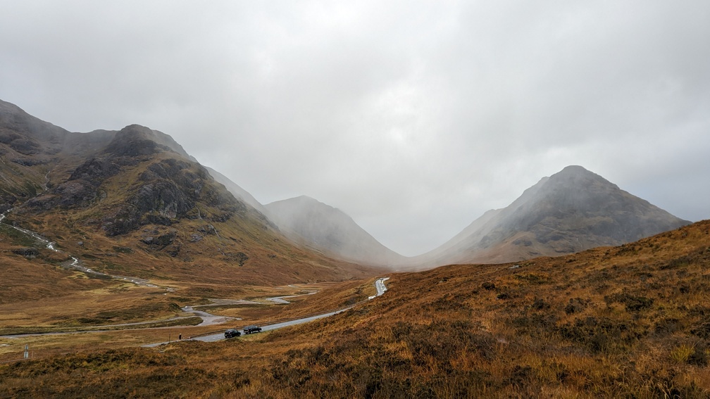 Once more the terrain opened out, the hills wreathed in low-hanging cloud. Very atmospheric, but with intermittent rain and a bit of a cold breeze, keeping going was the order of the day.
