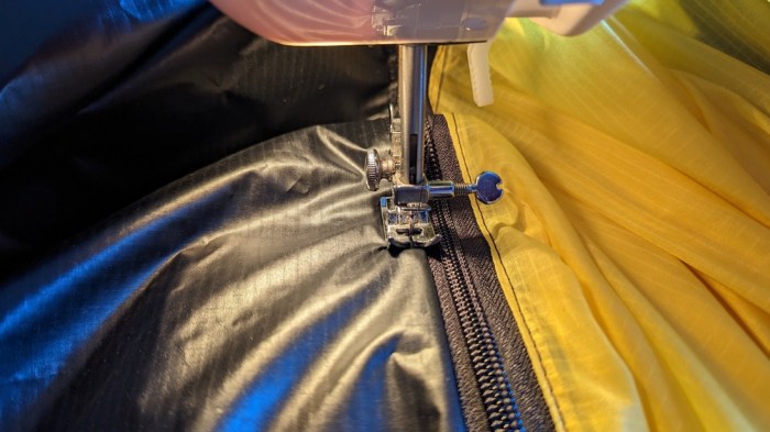 - Running each zipper the whole way to the edge of the fabric certainly avoided the issue of closing a gap and certainly gives a nice open front to the shelter, but it meant I had zipper in the seam area when joining the sides, which was difficult to sew. Conversely, though, running the zipper all the way to that seam provided a ready made “stop” to that end of the zipper.