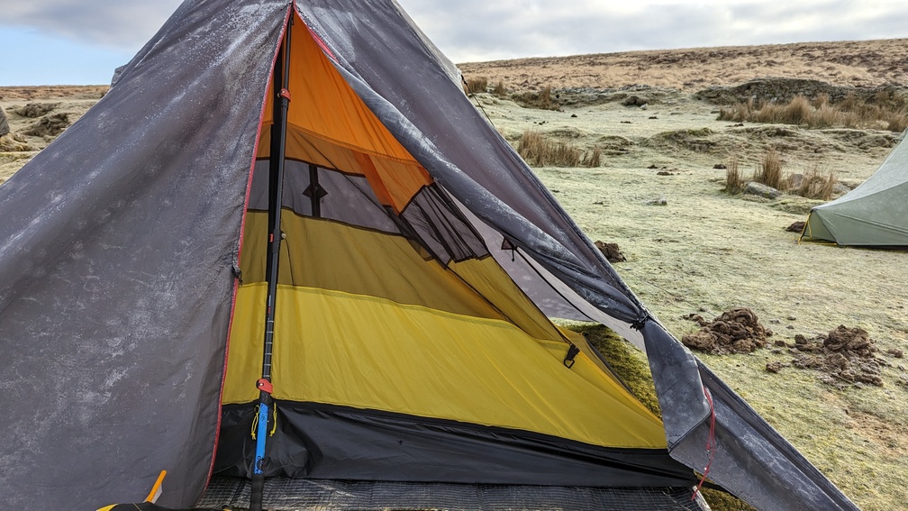 The second night, we pitched on White Tor – a rocky one without much flat grass to put a tent on, let alone the 6 needed for our group. I somehow managed to bag the nicest patch of actual ground for myself, and a fellow, but at the expense of being higher up and therefore, more exposed to the ENE wind. Having by far the tallest shelter in the group, it was ironic that I probably got the most exposed spot.