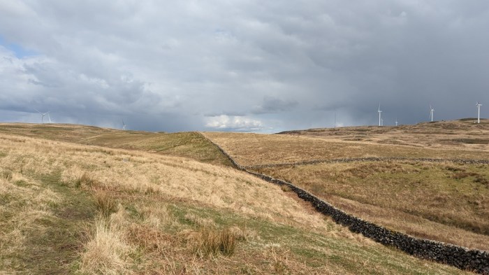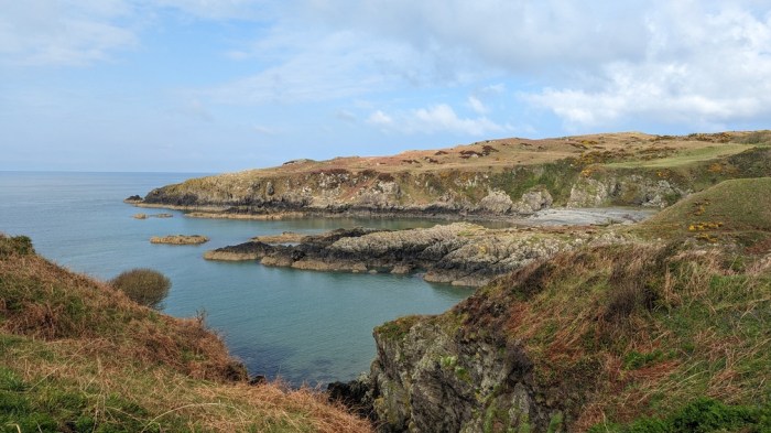 The lighthouse itself is privately owned, so nothing to see there, and we took our morning (coffee) stop in the lee of a stone wall, a bit further along the road. We’d got ahead of the other SUW hiker, who’d gone wrong climbing back onto the cliffs, but we could see her behind us for much of the morning.