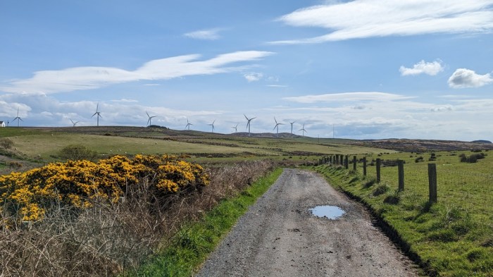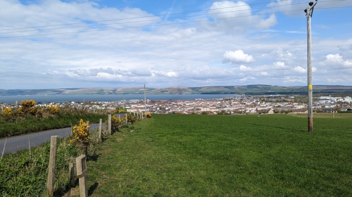 The afternoon’s walk was a lot less inspiring than the morning’s – the highlight probably being the view back to Stranraer. Paul spent much of the afternoon following the football and worrying about whether he’d get tickets to the Europa Conference final.