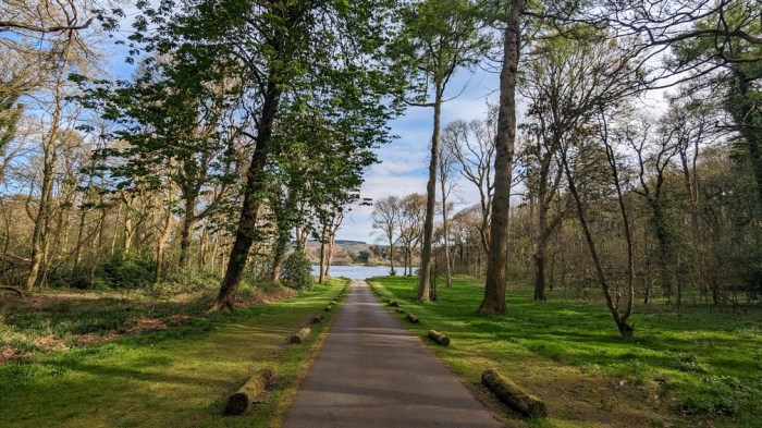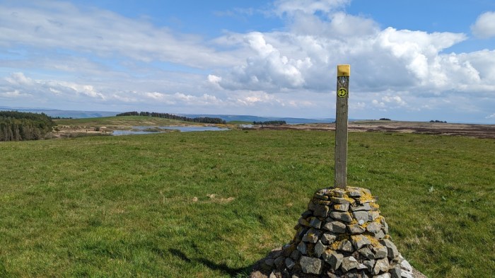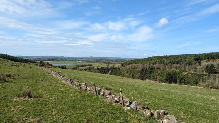 A taxi back to Castle Kennedy, then a walk down the driveway towards an inviting looking loch. Then a climb up above farmland into an area that we’d have struggled to find a camp spot the day before.