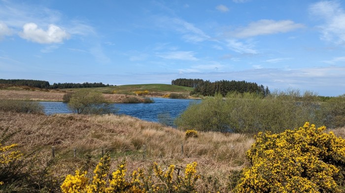 All of the lanes and paths were bedecked with gorse in bloom, and the day was very much scented cocount as a result. It was heaven. We climbed over a hill with a small cairn and a right turn, which would drop us down closer to Knockquhasen Reservoir which we could see from the top of the hill.