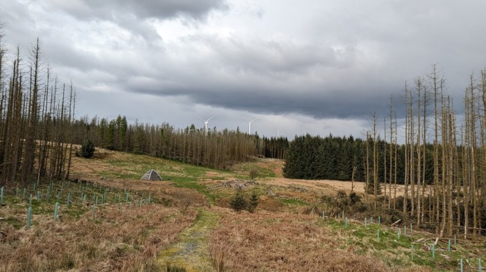 The route cut across the western side of Balmurrie Fell to enter the forest to the north, and after a boggy welcome to the periphery of the forest, I was soon on decent forest tracks and approaching the Beehive Bothy.