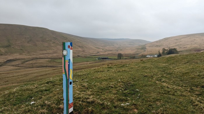 Away at 8am, I headed down the track to Polskeoch. Today’s walk was a simple matter of a track/road walk followed by a climb over a hill and a drop into Sanquahar. I spotted the first painted post where the track turned right and soon after became a road.