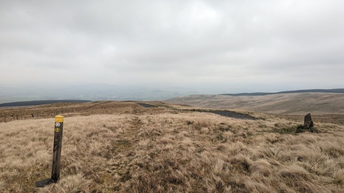 Now it was a case of rollercoastering over some lesser bumps, all following a fence line. Opting not to divert to Colt Hill, I struck off at the edge of the forest heading for Allan’s Cairn, meeting a couple of ladies coming the other way working to “fill in” a gap in their SUW walk.