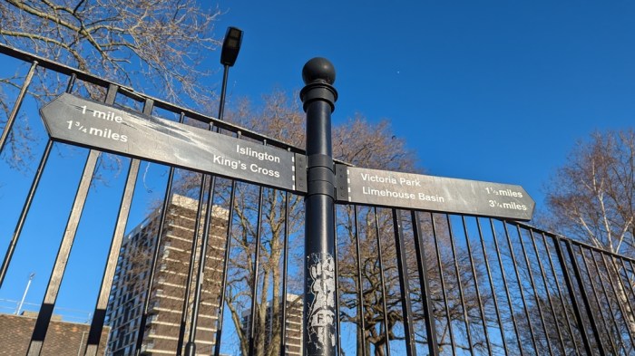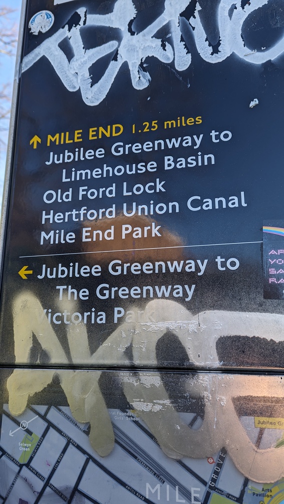 Finally, I’m at a sign where the path splits – one way east to the Lea Valley (which I walked in Part 1), one way back the way I’ve just come, and thirdly down the Regent’s Canal to Limehouse, where I started the walk 4 years ago.