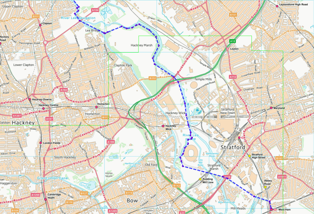 I decided to start at West Ham, and follow the Old River Lea, as it’s marked on maps there, through the Olympic Park and up the eastern side of Hackney Marshes to join up with the Lee Navigation near Lea Bridge.