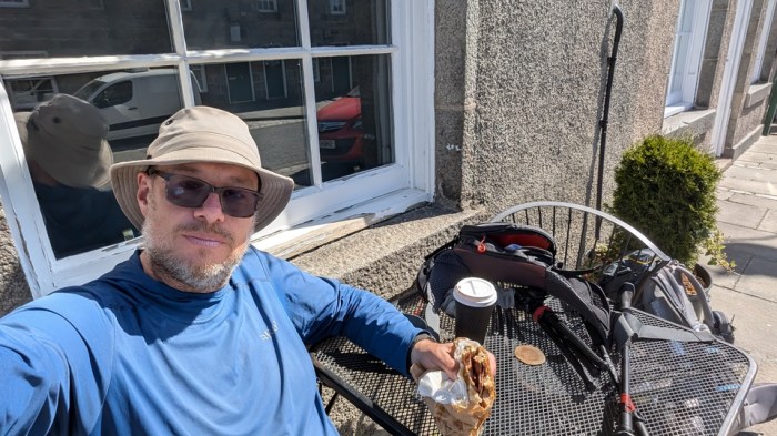 I made good progress until the hill and then slowed down, much as expected. I was still in Kincardine O’Neil for just after 10:30 and a had a long stop at the village store, sitting on the pavement sipping a milky coffee and noshing on a bacon and sausage bap.