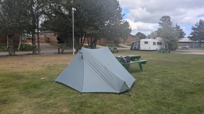 I remembered from last time I was here that the patch of ground for tents wasn’t great quality, but I’d forgotten why – it was stony and tree-rooted and consequently took an age to get tent pegs in satisfactorily.
