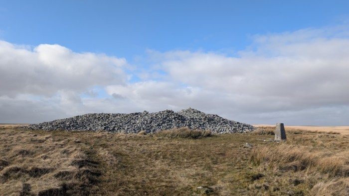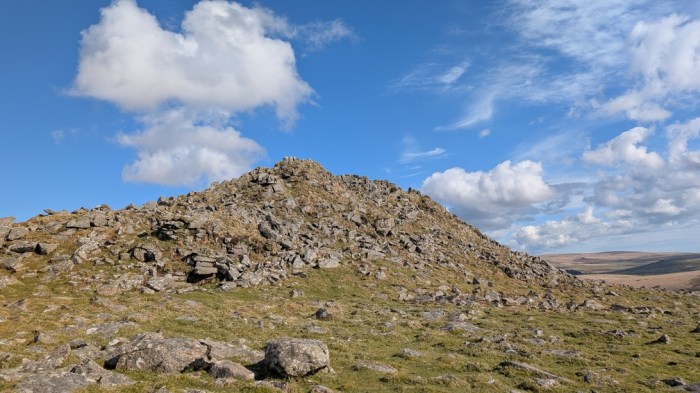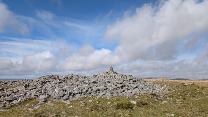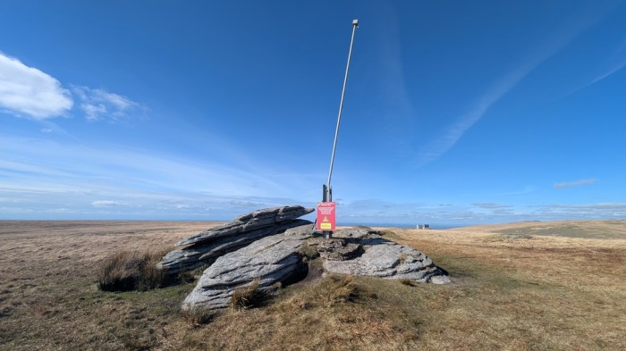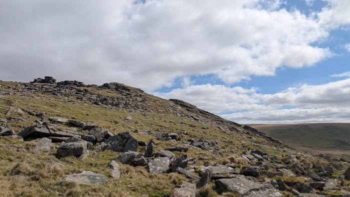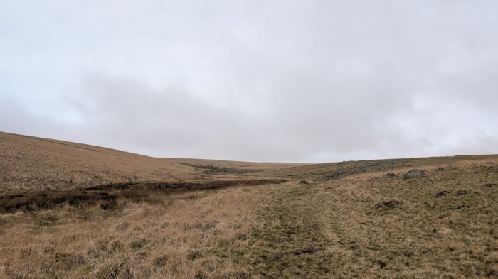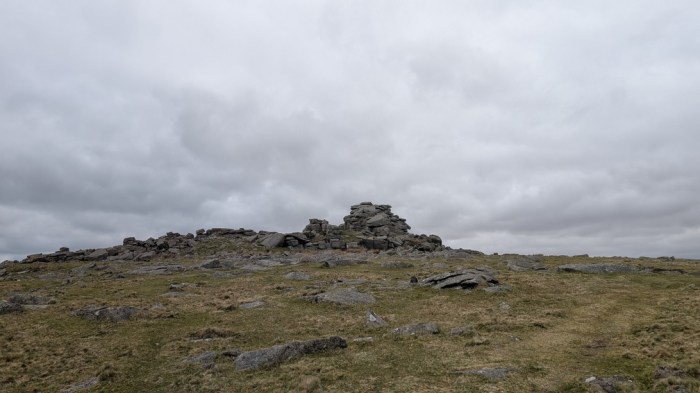 In any case my minimum target was Sharp Tor, but I didn’t bother with a detour as I could see very clearly that it wasn’t going to cut the wind much at all. I did pop up onto Three Barrows to see if one or more might provide some form of shelter at the same time as views, but no.