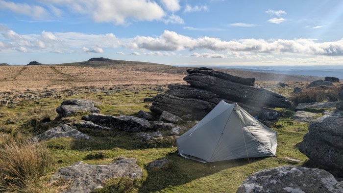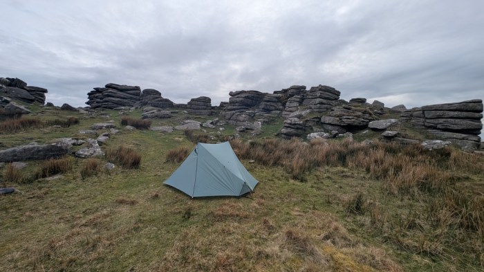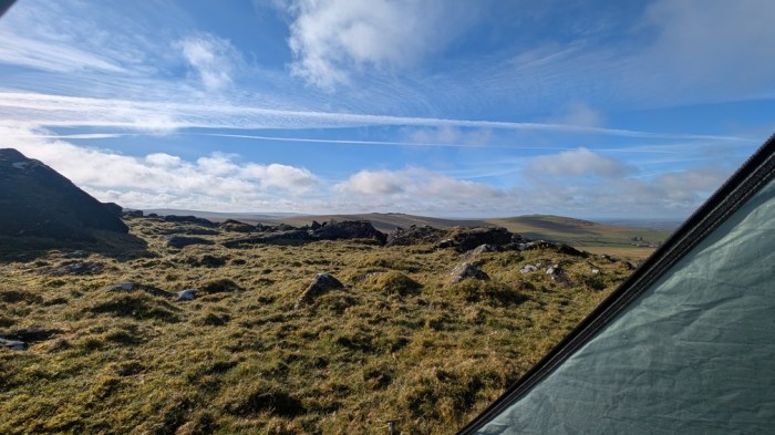 …except for that last night. I’d actually been sat in the tent on nights 2 and 3 just looking and listening to the tent in the wind, and been quietly satisfied with how it was handling things. Then night 4, in a supposedly sheltered spot, all hell broke loose. West Mill Tor did provide a good amount of shelter from the broadly westerly wind, not just from the force of it but from the wind chill too.